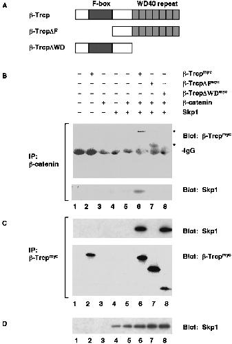 β-Trcp forms a complex with both β-catenin and Skp1. (A) Schematic diagram of wild-type β-Trcp, β-TrcpδF, and β-TrcpδWD. (B) Immunoprecipitation of β-catenin. The precipitates were examined for β-Trcp (Upper) and Skp1 (Lower). A longer exposure revealed that endogenous β-catenin also precipitated β-Trcpmyc (data not shown). (C) Immunoprecipitation of β-Trcpmyc using the same embryo extracts as in B. The precipitates were examined for Skp1 (Upper) and β-Trcp (Lower). (D) Immunoblot of Skp1 in the same embryo extracts as in B. RNA injected per embryo: 1 ng each for β-Trcpmyc and for deletion mutants β-catenin and Skp1.