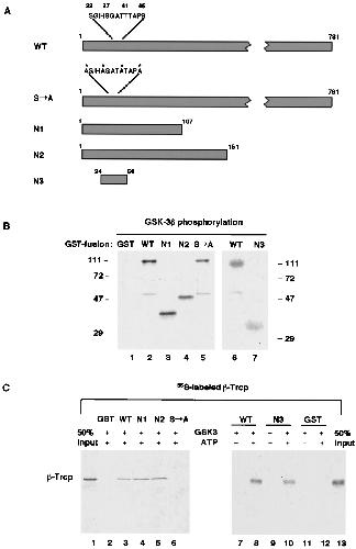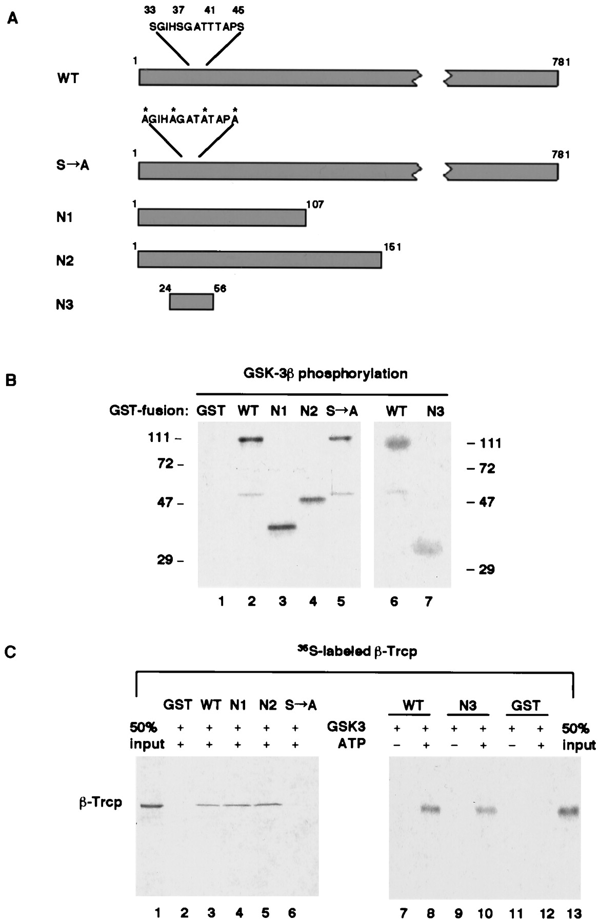 Phosphorylation of the amino-terminal region of β-catenin is necessary and sufficient for recognition by β-Trcp in vitro. (A) Schematic diagram of the wild-type and mutant derivatives of β-catenin. The four critical serine/threonine residues (S33, S37, T41, and S45), alanine substitutions of these residues in the S→A mutant, and surrounding residues are highlighted. Note that the Arm-repeat region that is required for Axin or TCF binding starts from residue 131. (B) Phosphorylation of β-catenin and its mutant derivatives (as GST-fusion proteins) by purified recombinant GSK-3β. Note that GST was not a substrate for GSK-3β. (C) On phosphorylation, N1, N2, and N3, but not β-catenin (S→A) were effectively recognized by β-Trcp. Lanes 1 and 13 represent 50% input of 35S-labeled β-Trcp in each GST-pull-down assay.