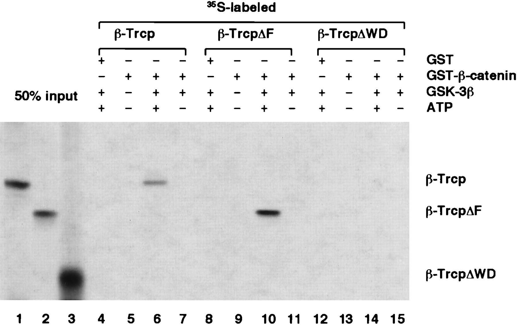 β-Trcp WD40-repeat domain recognizes GSK-3β-phosphorylated β-catenin in vitro. In this GST-pull-down assay, purified GST or GST-β-catenin was examined for its ability to bind 35S-labeled β-Trcp. GST-β-catenin on beads was either untreated or were treated with purified GSK-3β in the presence or absence of ATP before incubation with β-Trcp. Note that, in this experiment, GSK-3β and ATP were removed from phosphorylated GST-β-catenin by extensively washing the GST-β-catenin on beads after phosphorylation and before incubation with β-Trcp. Lanes 1–3 represent 50% of the input 35S-labeled β-Trcp or β-Trcp mutants used in each GST-pull-down assay.