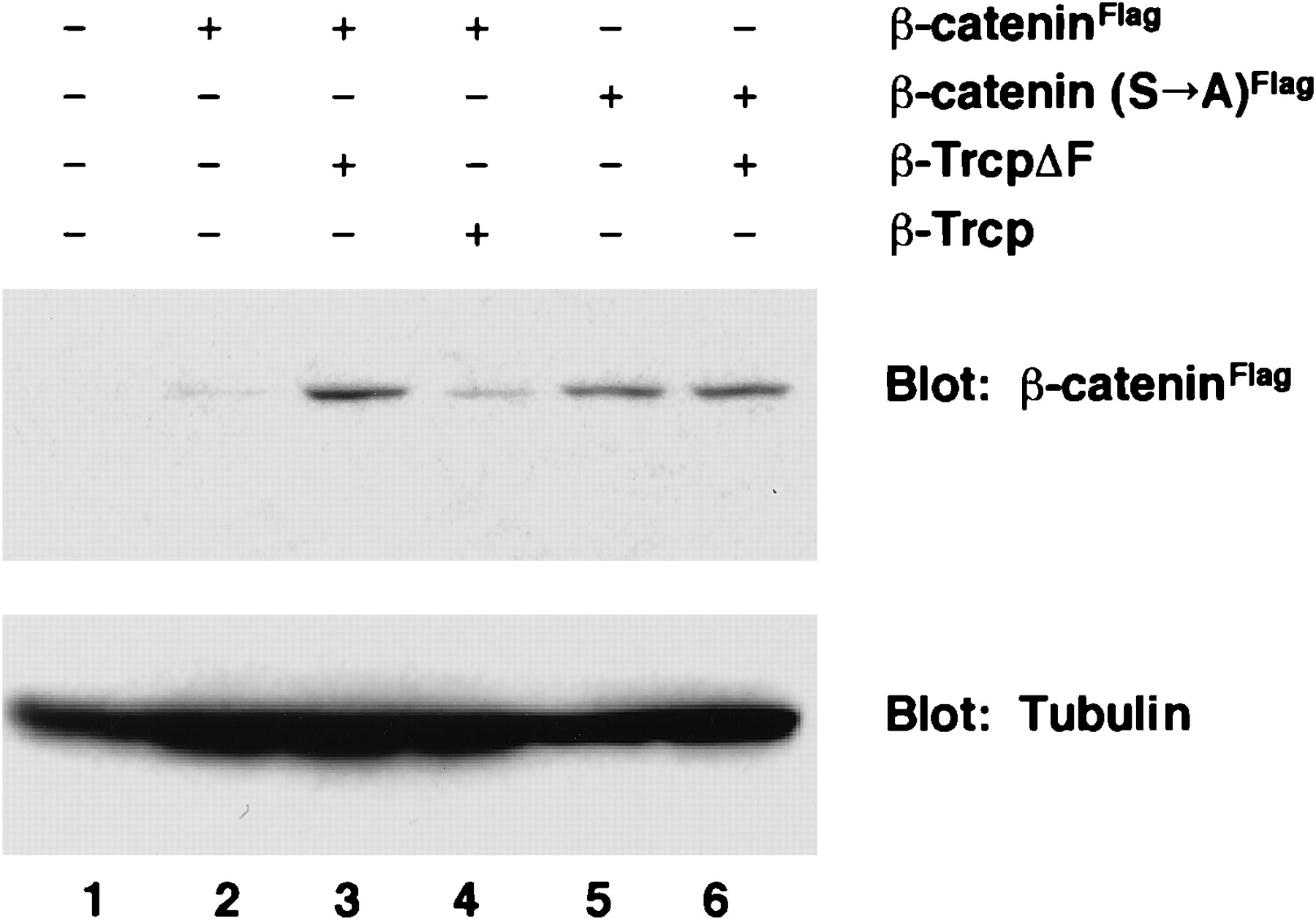 Inhibition of endogenous β-Trcp function by β-TrcpδF stabilizes β-catenin in vivo. Accumulation of β-cateninFlag or β-catenin (SâA)Flag protein was examined in stage 9 embryo extracts by immunoblotting with an anti-Flag antibody. Immunoblotting of tubulin was used as a protein loading control (Lower). This experiment were performed twice with similar results. RNA injected per embryo: 50 pg for β-cateninFlag or β-catenin (SâA)Flag; 4 ng for β-Trcp or β-TrcpδF.