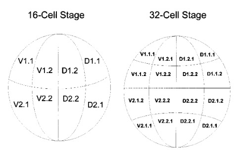 FIG. 1.Identification of injected blastomeres. Blastomeres were designated according to Moody (1987a,b) |