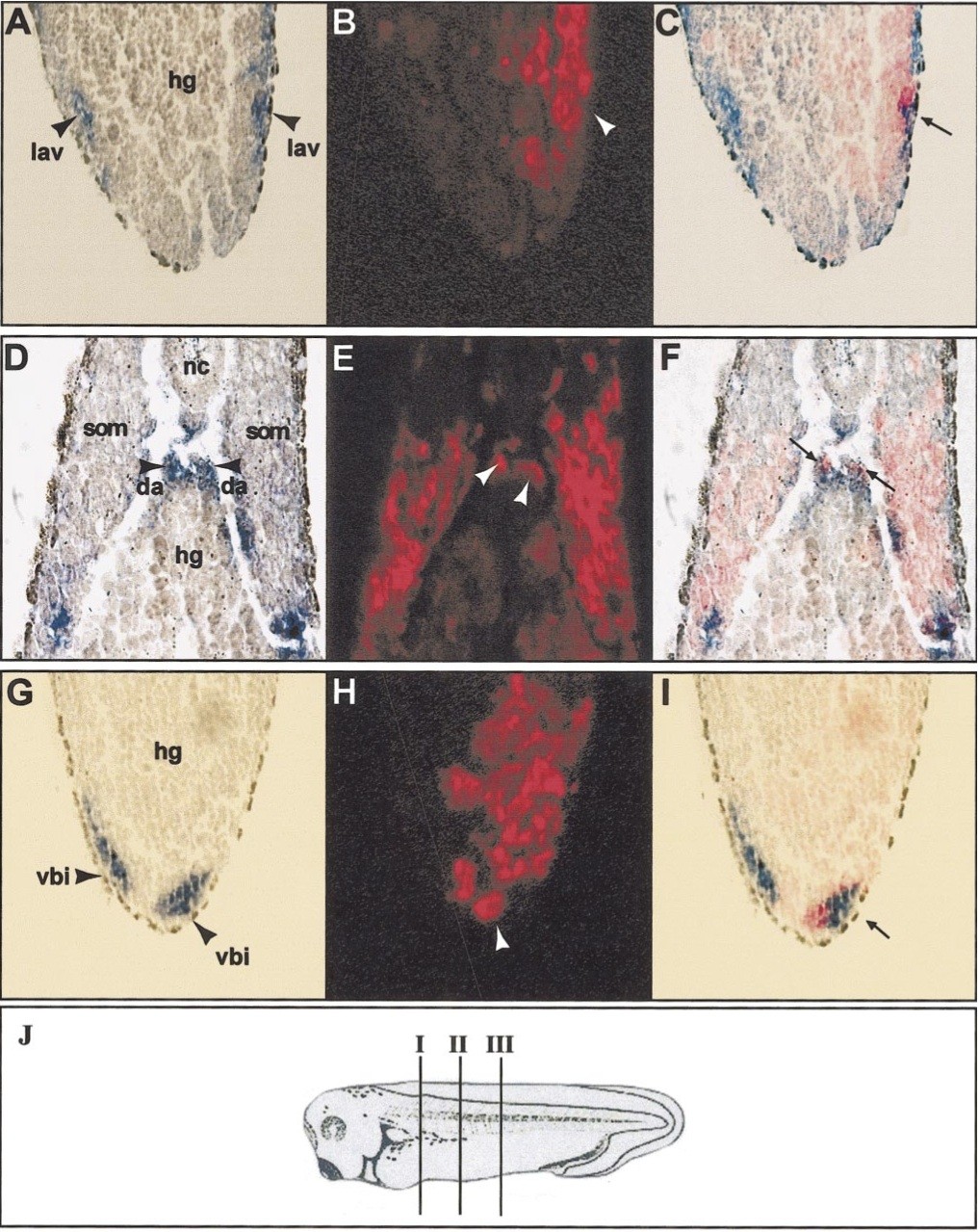 FIG. 4. Colocalization of X-msr or B-globin and RLDx. Following in situ hybridization, embryos were embedded in wax and transversely sectioned and then analyzed for the presence of either X-msr or B-globin and RLDx. Black arrowheads in A, D, and G indicate in situ hybridization signal for lateral abdominal veins, dorsal aorta, and ventral blood islands; white arrowheads in B, E, and H indicate the same location viewed under fluorescence. Arrows in C, F, and I show overlay of in situ hybridization signal with fluorescence in same region. (A, B, and C) Examples of X-msr staining in the lateral abdominal veins colocalizing with RLDx from blastomere V2.2. (A) X-msr signal, (B) fluorescence in the same section, and (C) an overlay of both images showing colocalization. (D, E, and F) Examples of X-msr signal colocalizing with RLDx from blastomere V2.1. (D) X-msr staining in the dorsal aorta, which lies ventral to the notochord and hypochord, (E) fluorescence in the same section, and (F) an overlay of both images. (G, H, and I) Examples of B-globin signal in the ventral blood islands colocalizing with RLDx from blastomere D2.1. (G) B-Globin signal, (H) fluorescence in the same section, and (I) an overlay of both images. Dorsal is toward the top of the page. Magnification for A and G is 200x, D is 250x. (J) Schematic indicating planes of section: I (A, B, C), II (D, E, F), and III (G, H, I). Diagram adapted from Nieuwkoop and Faber (1967). da, dorsal aorta; hg, hindgut; lav, lateral abdominal vein; nc, notochord; som, somite; vbi, ventral blood island. |