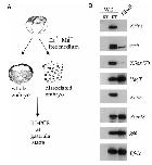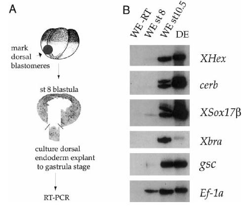 FIG 2. Anterior endomesoderm is specified by blastula stage. (A) Schematic diagram showing the experimental design. At the 4-cell stage, the dorsal blastomeres, which are lighter and smaller, are marked with Nile blue vital dye. At stage 7â8 the dorsal-vegetal tissues are explanted, free of mesoderm, and cultured until stage 10.5 when they are subjected to RT-PCR. (B) RT-PCR analysis of XHex, cerberus, XSox17Beta, gsc, Xbra, and Ef-1alpha expression in whole embryos stage 8 (WE st8) and stage 10.5 (WE st10.5), dorsal endoderm explants at stage 10.5 (DE), and a whole embryo stage 10.5 control cDNA with no reverse transcriptase (WE -RT). Mesoderm-free dorsal-vegetal explants that do not express Xbra do express XHex or cerberus. |