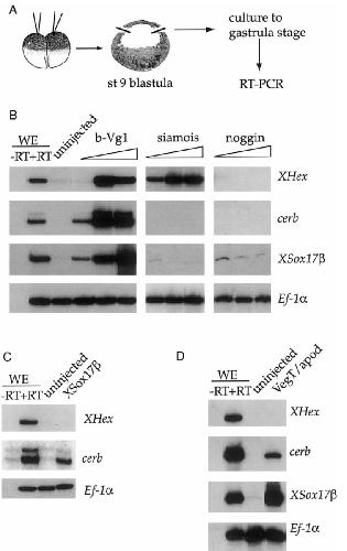 FIG. 5. Induction of XHex and cerberus in animal cap cells. (A) Synthetic mRNA was injected into the animal pole of 2-cell embryos. At stage 8â9 animal cap tissue was explanted and cultured until sibling embryos reached stage 10.5, when they were subjected to RT-PCR. (B) Embryos were injected with increasing doses of bVg1 mRNA (2, 20, 200 pg), siamois mRNA (10, 30, 100 pg), or noggin mRNA (10, 50, 200 pg). bVg1 induced XSox17ô°, XHex and cerberus, while siamois induced only XHex expression. (C) Animal caps injected with XSox17ô° mRNA (500 pg) express cerberus but not XHex. (D) Animal caps injected with VegT/apod mRNA (500 pg) express XSox17ô° and cerberus, but not XHex. Stage 10.5 whole embryo (WE) controls of cDNA with or without reverse transcriptase (ô°RT, ô°RT) are shown. |