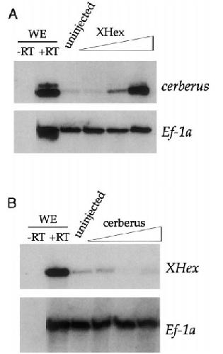 FIG 7. XHex can induce the expression of cerberus. The interre- lationship between XHex and cerberus expression was assayed by the injection of synthetic mRNA encoding either XHex (10, 100, 250 pg) or Cerberus (10, 100, 250 pg) into each ventral blastomere at the 4-cell stage, similar to the experimental design of Fig. 4. At stage 10.5, ventral endoderm tissue was explanted and assayed by RT-PCR for the expression of the other gene. XHex can induce cerberus, but Cerberus cannot induce XHex at the doses tested. Stage 10.5 whole-embryo (WE) controls of cDNA with or without reverse transcriptase (+RT, -RT) are shown. |