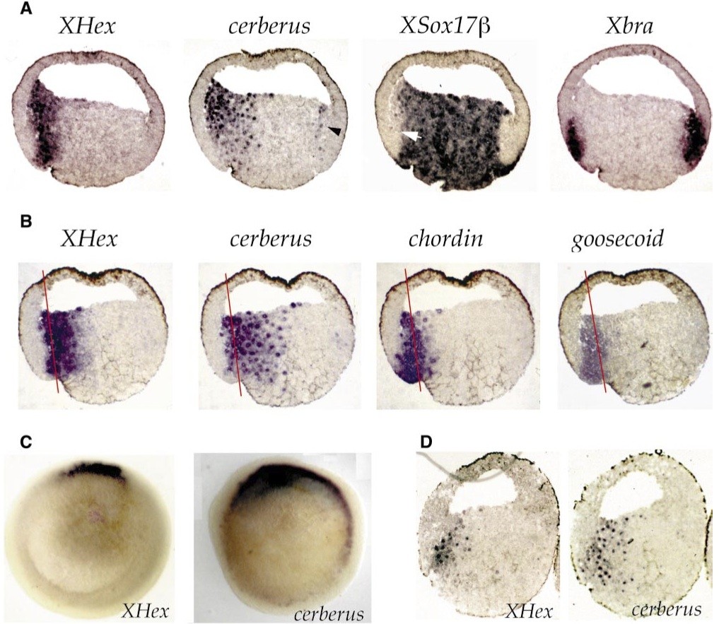 FIG. 1.XHex and cerberus are early markers of the anterior endomesoderm. In situ hybridisation to adjacent serial midsagittal sections of a stage 10ï° gastrula embryo. One embryo probed with (A) XHex, cerberus, XSox17b, and Xbra and another embryo probed with (B) XHex, cerberus, chordin, and goosecoid. The dorsal lip is oriented to the bottom left in each. XSox17b marks the future endoderm, Xbra marks the future mesoderm, with chordin and goosecoid marking both prechordal mesoderm and some endodermal cells. A group of cells in the deep organiser expressing XHex, cerberus, goosecoid, and chordin but not XSox17b or Xbra is indicated by the white arrowhead. cerberus-expressing cells at the ventral mesendoderm boundary are indicated by the black arrowhead. The approximate endoderm/ mesoderm boundary based on XSox17ï° expression is indicated by the red line. Notice XHex and cerberus are expressed in deep endoderm cells. (C) Cleared whole-mount in situ hybridisation of XHex and cerberus; both embryos are in vegetal view with the dorsal lip uppermost. Note that cerberus is expressed in a broader domain than XHex. (D) In situ hybridisation of XHex and cerberus to sectioned stage 9 blastulae shows that these genes are asymmetrically expressed in the vegetal-equatorial region on one side of the embryo prior to gastrulation. |