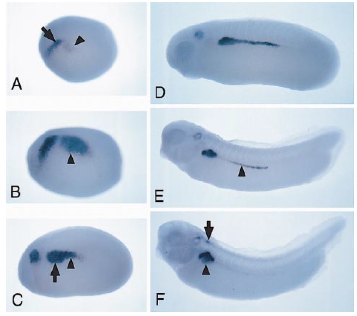 (arrow) and faintly in the intermediate mesoderm (arrowhead).