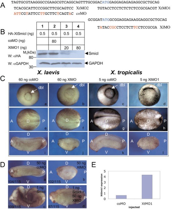 Fig. 2. Analysis of Smicl function in Xenopus laevis and Xenopus tropicalis. (A) The antisense morpholino oligonucleotides used in this study are aligned with their Xenopus tropicalis (Xt) and Xenopus laevis (Xl) target sequences. (B) XtMO1 inhibits translation of RNA encoding HA-tagged XtSmicl in a dose-dependent fashion. This is not observed with coMO. XtMO1 and coMO were injected in Xenopus embryos at the one-cell stage at the indicated concentrations, followed by RNA encoding HA-tagged XtSmicl. Embryos were cultured to early gastrula stage 10 and subjected to western blotting using an anti-HA antibody and an anti-Gapdh antibody as a loading control. (C) Injection of the morpholino oligonucleotides described in A disrupts gastrulation and axis formation in both Xenopus laevis and Xenopus tropicalis. Dbl, dorsal blastopore lip; A, anterior; P, posterior; D, dorsal; V, ventral. (D) Injection of mRNA encoding mouse Smicl into embryos of Xenopus laevis can escuethe phenotype caused by XlMO. Overexpression of mouse Smicl alone causes a pina bifidaphenotype. Quantitation of morpholino defects and rescues are indicated on the figure. (E) Injection of antisense morpholino oligonucleotide XtMO1 causes upregulation of Smicl mRNA. RNA was extracted at stage 10.5 from embryos injected with 5 ng XtMO1 or coMO and analysed by quantitative RT-PCR.