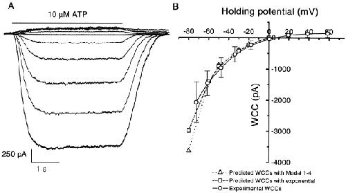 Figure 3. The current–voltage relationship of whole cell currents (WCCs). (A) Whole cell currents from an HEK 293 cell at different holding potentials: −100 to +80 mV at 20-mV intervals. Voltage drops from incomplete series resistance compensation were subtracted from the membrane potential. The currents were activated by 10 μM ATP in the presence of 1 mM extracellular Ca2+ with symmetrical Na+ solutions: 145 mM extracellular NaCl/145 mM intracellular NaF. The data were filtered at 2 kHz and digitized at 5 kHz. (B) The mean WCCs (±SD) (○, n = 5) and predicted WCCs activated by 10 μM ATP. The I–V curve exhibits strong inward rectification, similar to the single channel currents shown in Fig. 2. The reversal potential was ∼0 mV. The predicted WCCs were calculated using Eq. 15 where i (single channel amplitude) was taken from Fig. 2, and Po from the calculations for Model 1-4 (▵) (Fig. 13), and Eq. 16 (□) as a function of voltage. The number of channels was chosen so that the predicted WCC at −60 mV was equal to the experimental data. The predicted WCCs match reasonably well with the experimental data. |