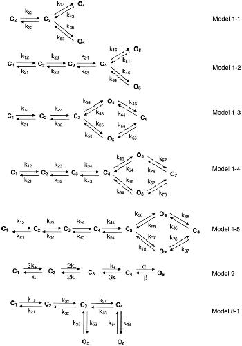Figure 13. Simplified and expanded versions of Model 1 from Fig. 11 (1-1, 1-2, 1-3, and 1-4), and other kinetic models (9 and 8-1) that have been used in the literature. |