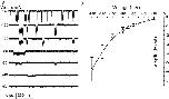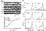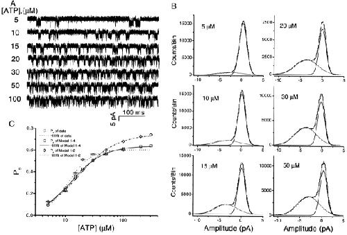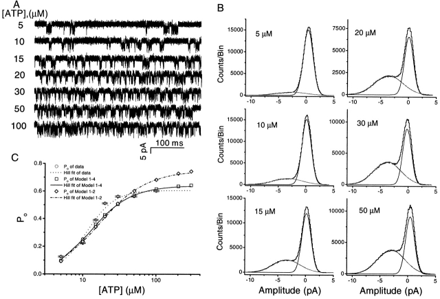 Figure 4. The effect of ATP concentration on single channel currents. (A) Single channel currents of P2X2 receptors expressed in Xenopus oocytes activated by different concentrations of ATP in the absence of extracellular Ca2+ (−120 mV). The data were filtered at 20 kHz and sampled at 40 kHz. All of the current traces in this figure are from the same patch. (B) All-points amplitude histograms of the currents from A (0.05 pA/bin), with the distributions fit to the sum of two Gaussians. At this bandwidth, the excess channel noise was ∼45% of the mean channel amplitude. (C) ATP dose–response curves. The probability of a channel being open is shown from experimental data (○) and simulated data generated by Fig. 13, Models 1-2 (⋄) and 1-4 (□), as a function of ATP concentration. Fits of the data sets to the Hill equation are shown as dotted (experimental data), dash dot (Model 1-2), and solid (Model 1-4) lines. The Hill coefficient = 2.3, EC50 = 11.0 μM, and maximum Po = 0.61 for the experimental data, 1.5, 17.4 μM, and 0.74 for simulated data of Model 1-2, and 1.8, 13.3 μM, and 0.64 for simulated data of Model 1-4. All the experimental data were from same patch. The errors in the experimental Po were estimated from the errors in the mean and standard deviation estimates reported by Origin when fitting the amplitude histograms to Gaussians. |