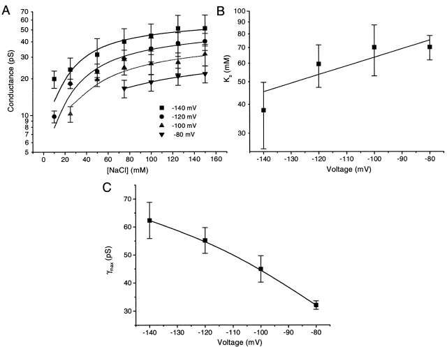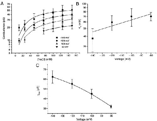 Figure 6. The affinity of Na+ for the channels. (A). The relationship between the mean open channel conductance from Fig. 5 and the NaCl concentration at different voltages. The error bars are the standard deviations of the excess open channel noise. The solid line is a fit of Eq. 9. Note that at each concentration the driving force changes because of the change in Nernst potential. We have assumed Ks is dependent only on the holding potential and not the driving force. (B) The dependence of Ks on holding potential. The solid line was fit by the Boltzmann equation with z = 1, δ = 0.21, and Ks(0) = 148 mM. A depolarization of 118 mV is required for an e-fold increase of Ks. The error bars are the parameter fitting errors from A. (C) The maximal conductance as a function of holding potential. The error bars are the fitting errors from A. The solid line is simply the connection of data. The conductance is approximately linear with the holding potential supporting the simple approximation of Eq. 9. |