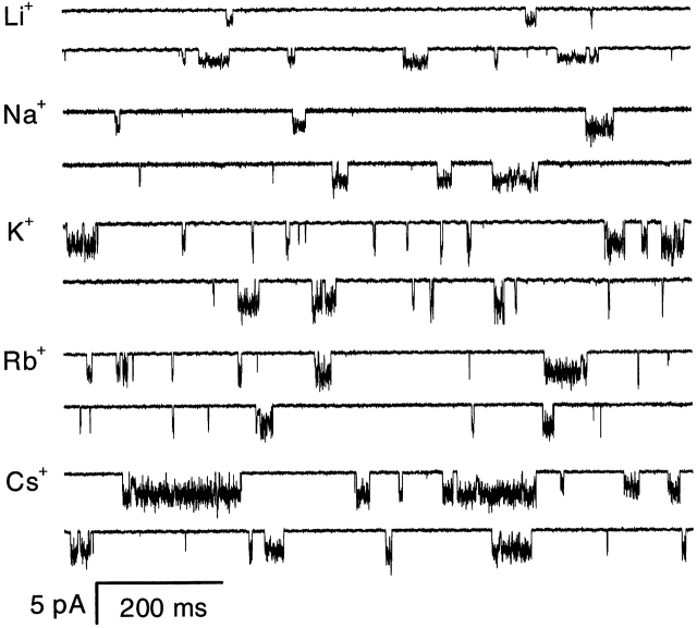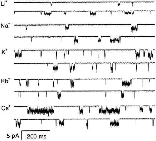 Figure 7. The effect of different permeant ions on the single channel currents. Single channel currents from HEK 293 cells at −120 mV activated by 2 μM ATP in the presence of 1 mM Mg2+ and Ca2+ from an outside-out patch. The data were filtered at 5 kHz and digitized at 10 kHz. |