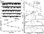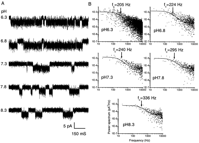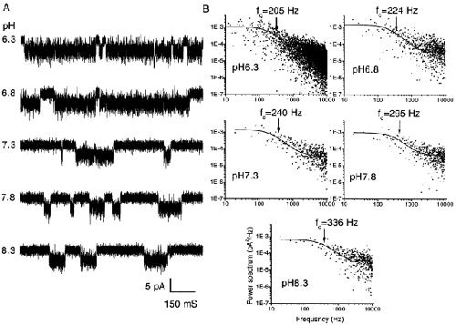 Figure 9. The effect of extracellular pH on single channel currents. (A) Currents recorded from an outside-out patch of an HEK 293 cell under the same experimental conditions as in Fig. 8 A. The data were low-pass filtered at 10 kHz and digitized at 20 kHz. (B) Differential power spectra of the open channel currents at different values of extracellular pH. The spectra were fit with the sum of a Lorentzian function plus a constant (solid line). The corner frequencies are indicated by the arrows. Plotted spectra are averages of three separate data segments. |