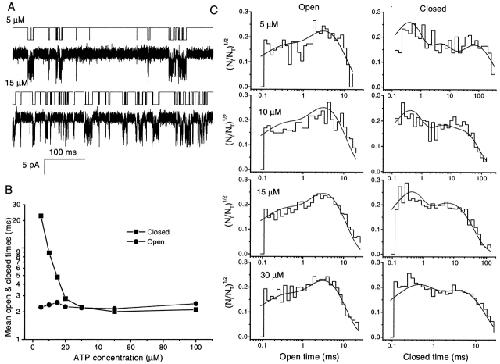 Figure 10. Idealization and open- and closed-interval duration histograms of single channel currents activated by different ATP concentrations (from the data in Fig. 4 A). (A) Examples of idealized single channel currents activated by 5 and 15 μM ATP. These data were recorded at 40 kHz and filtered at 20 kHz. Before idealization, the data were further filtered at 5 kHz using a Gaussian digital filter. The idealization was performed with the segmental k-means method based on a two-state model (see materials and methods). (B) The mean open and closed times of single channel currents as a function of ATP concentration. (C) The open- and closed-time histograms of single channel currents activated by different concentrations of ATP. The solid lines are the predicted probability density functions for Fig. 13, Model 1-4, with rate constants determined by global fitting across concentrations (see Table VIII). Ni/NT on the ordinate is the ratio of the number of events per bin to the total number of events. |
