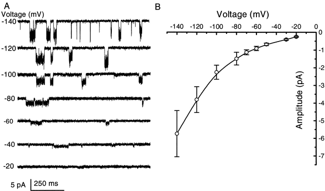 Figure 2. The current–voltage relationship of single channel currents. (A) Single channel currents of an outside-out patch from HEK 293 cells activated by 2 μM ATP (1 mM extracellular Mg2+ and Ca2+ at different membrane potentials, symmetrical Na+ solutions containing 145 mM extracellular NaCl/145 mM intracellular NaF). The data were filtered at 5 kHz and digitized at 10 kHz. All of the current traces in this figure are from the same patch. (B) Mean I–V relationship of single channel currents. The error bars indicate the standard deviation of the single channel currents from the all-points histograms. The single channel I–V relationship shows strong inward rectification despite exposure to identical Na+ solutions across the patch. The same result was obtained when single channel currents were recorded in the absence of Mg2+ and Ca2+; therefore, divalent cations are not responsible for the rectification. |