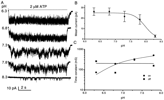 Figure 8. The effect of pH on the affinity of channel for ATP. (A) Multiple-channel currents from an outside-out patch of HEK cells at −120 mV and 2 μM ATP at different values of extracellular pH (0.3 mM extracellular Ca2+). Note the increase in rise time with increasing pH. The data were low pass filtered at 5 kHz and digitized at 10 kHz. The horizontal bar indicates the duration of ATP application. (B) The effect of pH on mean patch current. The data were fitted by the Hill equation with a maximum mean current of 25.1 pA, an EC50 of pH 7.9 (pKa), and a Hill coefficient of 2.5. The error bars are the standard deviation of the data and contain both open channel and gating noise. (C) The pH dependence of the rise and fall times. The time constants for rising (•) and falling (▪) phase were obtained from fitting single exponential functions (solid lines) to multiple channel currents. |