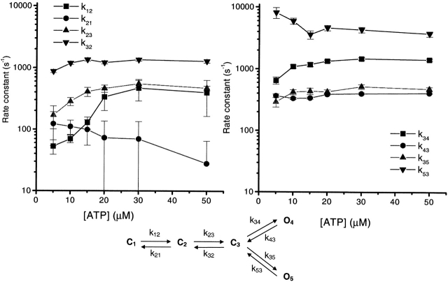 Figure 12. The effect of ATP concentration on the rate constants near the open states. The rate constants are based on kinetic Model 1 (shown at bottom), with each data set fit separately. Missed events were corrected by imposing a dead time of 0.05 ms. k12 and k23 are the most sensitive to the concentration of ATP, increasing over the range from 5 to 20 μM, and saturating at higher concentrations. The rate constants are plotted in two panels to avoid overlap (the scales in both plots are identical). |