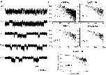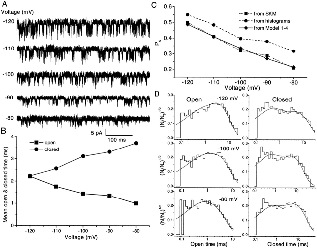 Figure 15. The effect of voltage on the single channel currents, mean open and closed times, and Po. (A) Single-channel currents activated by 30 μM ATP were recorded at different membrane potentials. Other conditions were the same as in Fig. 4. All the current traces in this figure are from the same patch. The currents were idealized for further kinetic analysis after filtering at 5 kHz using a Gaussian digital filter. (B) Mean open and closed times extracted from the idealized currents as a function of voltage. (C) The probability of being open, Po, as function of voltage calculated from idealized currents (▪), all-points histograms (•), and the prediction by Fig. 13, Model 1-4 (♦). Po from the histogram is slightly larger than that from idealized currents, indicating that some short-lived openings were missed during idealization. Po predicted by Model 1-4 is close to Po from idealized currents. (D) The closed and open time histograms at different voltages. The solid lines in the histograms are predicted probability density functions based on Model 1-4. Ni/NT has the same meaning as in Fig. 10 C. |