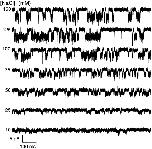 Figure 5. The effect of extracellular NaCl concentration on the single channel current amplitude. Currents activated by 15 μM ATP were recorded from an outside-out patch from a Xenopus oocyte with different concentrations of NaCl without ionic substitution (different ionic strength) in the absence of Ca2+ at −120 mV. The data were digitized at 20 kHz and low pass filtered at 10 kHz. |
