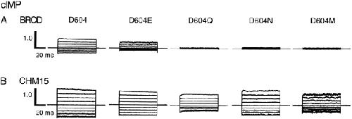 Figure 3. Current families for wild-type and mutant channels activated by cIMP. Current families are shown from inside-out patches excised from Xenopus laevis oocytes expressing BROD (A) and CHM15 (B) channels with mutations at position 604. Currents were elicited by 16 mM cIMP and voltage pulses from 0 mV to potentials between −80 and +80 mV in 20-mV steps. Leak currents in the absence of cyclic nucleotides were subtracted. The currents were normalized (using the +80-mV trace) to the maximum current obtained after Ni2+ potentiation (Gordon and Zagotta, 1995a) in the presence of a saturating concentration of the best agonist. |