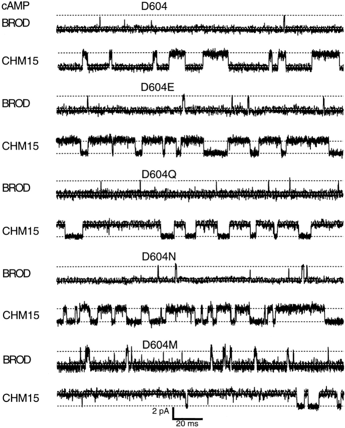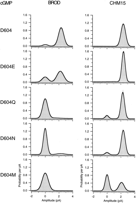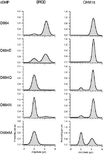 Figure 7. Amplitude histograms for activation by a saturating concentration of cGMP. Amplitude histograms corresponding to the representative traces in Fig. 6 are shown. The histograms were fit to the sum of two Gaussians, and the peak of the closed level Gaussian was used to subtract off leak currents. The parameters for the amplitude histograms were as follows: for BROD, σclosed = 480 fA, σopen = 560 fA, Popen = 0.95; for CHM15, σclosed = 1.6 pA, σopen = 340 fA, Popen = 0.99; for BROD-D604E, σclosed = 490 fA, σopen = 430 fA, Popen = 0.71; for CHM15-D604E, σclosed = 850 fA, σopen = 240 fA, Popen = 0.97; for BROD-D604Q, σclosed = 380 fA, σopen = 890 fA, Popen = 0.06; for CHM15-D604Q, σclosed = 240 fA, σopen = 270 fA, Popen = 0.91; for BROD-D604N, σclosed = 270 fA, σopen = 560 fA, Popen = 0.07; for CHM15-D604N, σclosed = 260 fA, σopen = 290 fA, Popen = 0.92; for BROD-D604M, σclosed = 440 fA, σopen = 1.33 pA, Popen = 0.003; for CHM15-D604M, σclosed = 270 fA, σopen = 390 fA, Popen = 0.42. |