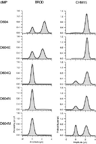 Figure 9. Amplitude histograms for activation by a saturating concentration of cIMP. Amplitude histograms corresponding to the representative traces in Fig. 8 are shown. The histograms were fit to the sum of two Gaussians, and the peak of the closed level Gaussian was used to subtract off leak currents. The parameters for the amplitude histograms were as follows: for BROD, σclosed = 240 fA, σopen = 360 fA, Popen = 0.74; for CHM15, σclosed = 530 fA, σopen = 270 fA, Popen = 0.96; for BROD-D604E, σclosed = 300 fA, σopen = 360 fA, Popen = 0.62; for CHM15-D604E, σclosed = 930 fA, σopen = 250 fA, Popen = 0.96; for BROD-D604Q, σclosed = 250 fA, σopen = 610 fA, Popen = 0.011; for CHM15-D604Q, σclosed = 320 fA, σopen = 360 fA, Popen = 0.81; for BROD-D604N, σclosed = 260 fA, σopen = 650 fA, Popen = 0.044; for CHM15-D604N, σclosed = 290 fA, σopen = 320 fA, Popen = 0.80; for BROD-D604M, σclosed = 320 fA, σopen = 610 fA, Popen = 0.009; for CHM15-D604M, σclosed = 210 fA, σopen = 340 fA, Popen = 0.59. |