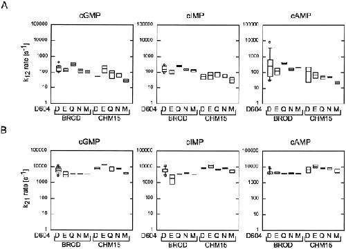Figure 13. Box plot summaries for k12 and k21. Box plots of the k12 (A) and k21 (B) rate constants for the C0 ↔ O1 ↔ C2 scheme are shown for all 10 constructs for cGMP, cIMP, and cAMP. Values for the rate constants were determined by HMM analysis. |