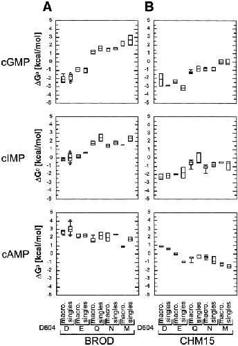 Figure 5. Thermodynamic mutant cycles identify direct interactions between cyclic nucleotides and D604. (A) The effect of substituting the olfactory amino terminal region for the BROD amino terminal region was cyclic nucleotide independent. (B) The effect of mutating D604 to D604M was strongly cyclic nucleotide dependent, indicating that the amino acid at position 604 is critical for cGMP vs. cAMP discrimination by the channel. |