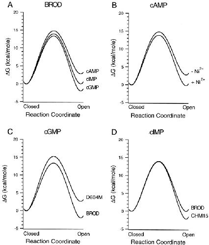 Figure 15. Free energy profile for the allosteric transition. The free energy profiles for the allosteric transition (C0 ↔ O1) are illustrated based on the median values of the rate constants determined from HMM analysis of the single-channel currents. The rate constants were converted to energies using simple transition-state theory, with the highest energy intermediate postulated to break down to product at the vibrational frequency of a covalent bond. (A) Free energy profiles for cGMP, cIMP, and cAMP on BROD channels. (B) Free energy profiles for cAMP with and without Ni2+. (C) The free energy profiles of the allosteric transition for BROD and BROD-D604M channels activated by a saturating concentration of cGMP. (D) The free energy profiles of the allosteric transition for BROD and CHM15 channels activated by a saturating concentration of cIMP. |