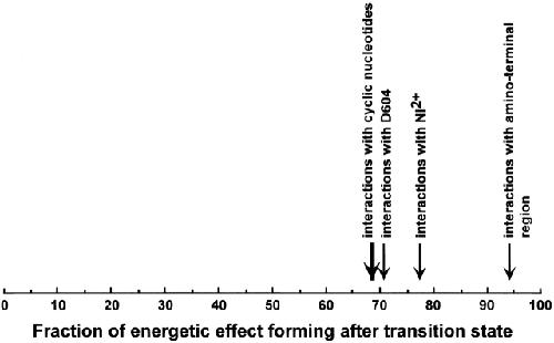 Figure 16. Fraction of energetic effect occurring after the allosteric transition. The fraction of the energetic effect occurring after the allosteric transition was calculated as ΔΔG‡/ΔΔG0 = |(ΔG‡1 − ΔG‡2)/(ΔG01 − ΔG02)|, where ΔG‡ is the activation energy for the closing transition, ΔG0 is the standard free energy for the allosteric transition, and the subscript indicates the different conditions of allosteric modulation. ΔGs were the median values determined from an HMM analysis of the single-channel currents. The ΔΔG‡/ΔΔG0 for the interactions with different cyclic nucleotides was the average of the values for BROD channels between cGMP and cIMP, cGMP and cAMP, and cIMP and cAMP. The ΔΔG‡/ΔΔG0 for the interactions with D604 was the average of the values between BROD channels and D604M channels and between CHM15 channels and CHM15-D604M channels for all three cyclic nucleotides. The ΔΔG‡/ΔΔG0 for the interactions with Ni2+ was the average of the values between BROD channels with and without Ni2+ for cIMP and cAMP (Sunderman and Zagotta, 1999). The ΔΔG‡/ ΔΔG0 for the interactions with the amino terminal region was the average of the values between BROD channels and CHM15 channels for all three cyclic nucleotides. |