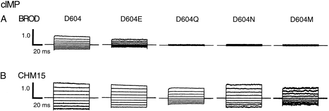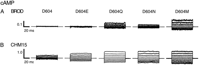 Figure 4. Current families for wild-type and mutant channels activated by cAMP. Current families are shown from inside-out patches excised from Xenopus laevis oocytes expressing BROD (A) and CHM15 (B) channels with mutations at position 604. Currents were elicited by 16 mM cAMP and voltage pulses from 0 mV to potentials between −80 and +80 mV in 20-mV steps. Leak currents in the absence of cyclic nucleotides were subtracted. The currents were normalized (using the +80-mV trace) to the maximum current obtained after Ni2+ potentiation (Gordon and Zagotta, 1995a) in the presence of a saturating concentration of the best agonist. |