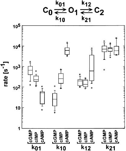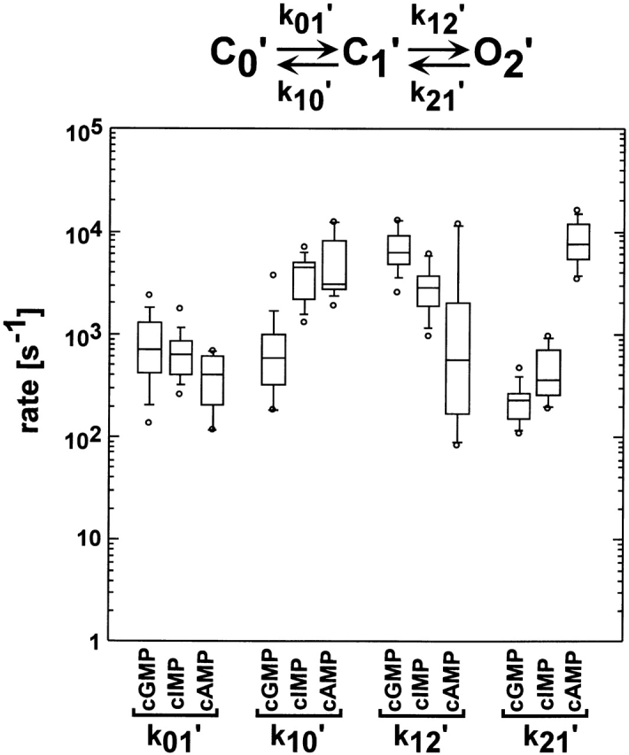 Figure 13. Box plots of rate constants for the C0′ ↔ C1′ ↔ O2′ scheme. Box plots of the k01′, k10′, k12′, and k21′ rate constants for the C0′ ↔ C1′ ↔ O2′ scheme from 14 different patches. Values for the rate constants were determined by HMM analysis. The horizontal line within each box indicates the median of the data, boxes show the 25th and 75th percentiles of the data, and whiskers show the 5th and 95th percentiles. Extreme data points are also indicated. |