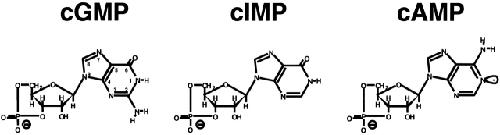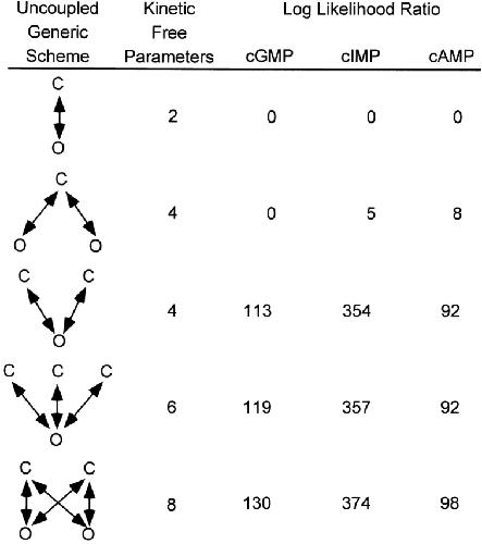Figure 12. Model discrimination. Log likelihood ratios from an HMM analysis with five uncoupled generic schemes of single channel data recorded with 16 mM cGMP, cIMP, or cAMP. A convergence criterion of 10−8 was used. The log-likelihoods obtained from the analysis were normalized by subtracting the log-likelihoods obtained for the two-state C ↔ O scheme. |