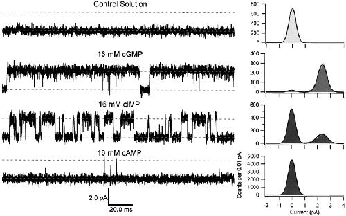 Figure 4. Representative single-channel currents. Single-channel currents were recorded in the presence of 16 mM cGMP, cIMP, or cAMP with the membrane voltage clamped at +80 mV. Each sweep was 200 ms in duration. The upper and lower dotted lines indicate the open and closed levels, respectively, and are separated by 2.3 pA. The amplitude histograms were normalized to unit area and were fit by the sum of two Gaussians with variances σclosed2 and σopen2 for the closed and open distributions, respectively. Parameters for amplitude histograms were as follows: control solution: σclosed = 280 fA; 16 mM cGMP: σclosed = 300 fA, Pclosed = 0.05, μopen = 2.4 pA, σopen = 349 fA, Popen = 0.95; 16 mM cIMP: σclosed = 289 fA, Pclosed = 0.71, μopen = 2.3 pA, σopen = 431 fA, Popen = 0.29; 16 mM cAMP: σclosed = 287 fA, Pclosed = 0.997, μopen = 2.4 pA, σopen = 500 fA, Popen = 0.003. |