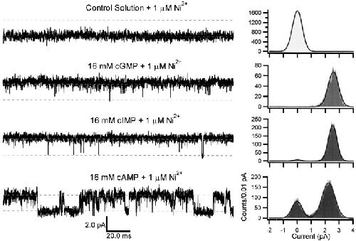 Figure 5. Representative single-channel currents in the presence of Ni2+. Single-channel currents were recorded in the presence of 16 mM cGMP, cIMP, or cAMP, and 1 μM Ni2+. Data are for the same patch as in Fig. 4. Each sweep was 200 ms in duration. The upper and lower dotted lines indicate the open and closed levels, respectively, and are separated by 2.3 pA. The amplitude histograms were normalized to unit area and were fit by the sum of two Gaussians. Parameters for amplitude histograms were as follows: control solution + 1 μM Ni2+: σclosed = 353 fA; 16 mM cGMP + 1 μM Ni2+: σclosed = 2 pA, Pclosed = 0.01, μopen = 2.5 pA, σopen = 374 fA, Popen = 0.99; 16 mM cIMP + 1 μM Ni2+: σclosed = 236 fA, Pclosed = 0.03, μopen = 2.5 pA, σopen = 311 fA, Popen = 0.97; 16 mM cAMP + 1 μM Ni2+: σclosed = 360 fA, Pclosed = 0.28, μopen = 2.3 pA, σopen = 457 fA, Popen = 0.72. |