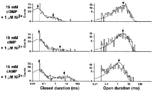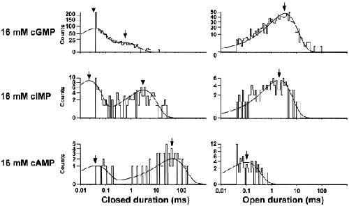 Figure 10. Half-amplitude threshold analysis of currents in the presence of Ni2+. Closed (left) and open (right) duration histograms for single-channel data recorded with 16 mM cGMP, cIMP, or cAMP, and 1 μM Ni2+. Closed durations were fit to a double and open durations to a single exponential distribution. The time constants are indicated by the arrows. Parameters for the closed duration histograms were as follows: 16 mM cGMP: 357 events in histogram, τ(short) = 36 μs (weight, 0.85), τ(long) = 548 μs (weight, 0.15); 16 mM cIMP: 407 events in histogram, τ(short) = 36 μs (weight, 0.96), τ(long) = 3.25 ms (weight, 0.04); 16 mM cAMP: 443 events in histogram, τ(short) = 40 μs (weight, 0.84), τ(long) = 6.3 ms (weight, 0.16). Parameters for the open duration histograms were as follows: 16 mM cGMP: 357 events, τ = 3.57 ms; 16 mM cIMP: 407 events, τ = 3.56 ms; 16 mM cAMP: 443 events, τ = 1.46 ms. |