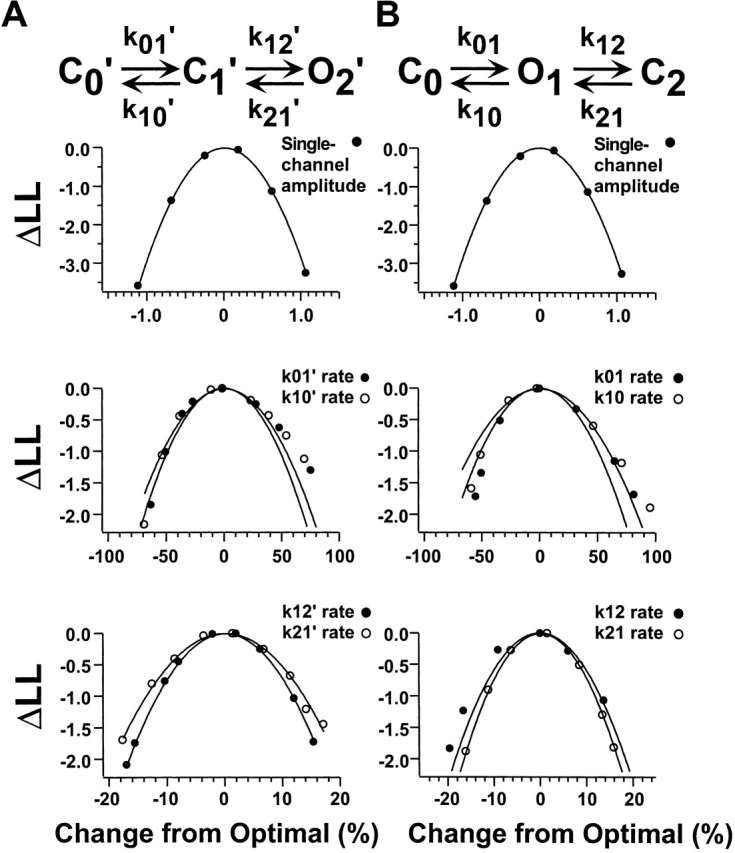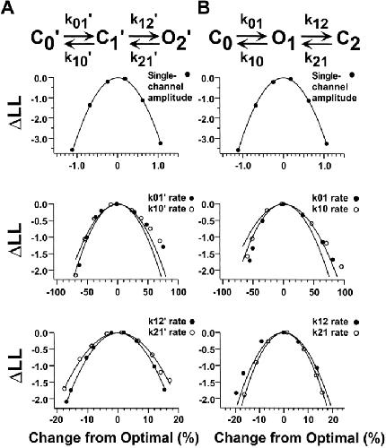 Figure 15. Errors in the determination of the rate constants and single-channel amplitude from HMM analysis. For this analysis, a 0.73-s segment (or 18,198 sample points) from a single-channel patch activated by cGMP was tested to determine the errors in the determination of the rate constants due to the method (see methods). The approach was applied separately for the (A) C0′ ↔ C1′ ↔ O2′ and (B) C ↔ O ↔ C schemes. The abscissa is the percent change in the value of the parameter away from the maximum-likelihood rate. The ordinate is the change in log likelihood from the maximum-likelihood value. The curves were fit by Eq. 1. |