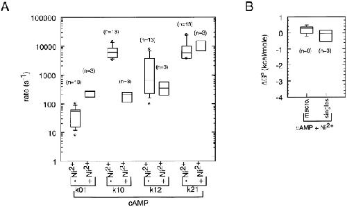 Figure 17. The effect of Ni2+ on HMM rate constants for cIMP. (A) Comparison of rate constants for cIMP with and without Ni2+. Values for the rate constants were determined by HMM analysis. The horizontal line within each box indicates the median of the data, boxes show the 25th and 75th percentiles of the data, and whiskers show the 5th and 95th percentiles. Extreme data points are also indicated. (B) Comparison of values for ΔG0 for activation by cIMP in the presence of Ni2+ between macroscopic and single-channel experiments. |