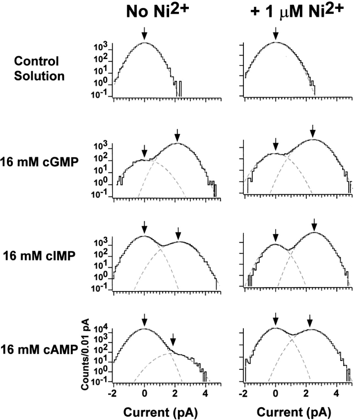 Figure 7. Amplitude histograms on log–linear axes with inverse filtering. The amplitude histograms were fit by the sum of two Gaussians, which appear as parabolas on a log scale. Parameters for the histograms in the absence of Ni2+ were as follows: control solution: σclosed = 480 fA; 16 mM cGMP: σclosed = 580 fA, Pclosed = 0.045, μopen = 2.2 pA, σopen = 590 fA, Popen = 0.955; 16 mM cIMP: σclosed = 490 fA, Pclosed = 0.71, μopen = 2.2 pA, σopen = 640 fA, Popen = 0.286; 16 mM cAMP: σclosed = 500 fA, Pclosed = 0.989, μopen = 2.0 pA, σopen = 960 fA, Popen = 0.011. Parameters for the histograms in the presence of Ni2+ were as follows: control solution + 1 μM Ni2+: σclosed = 520 fA; 16 mM cGMP + 1 μM Ni2+: σclosed = 590 fA, Pclosed = 0.036, μopen = 2.4 pA, σopen = 600 fA, Popen = 0.964; 16 mM cIMP + 1 μM Ni2+: σclosed = 470 fA, Pclosed = 0.071, μopen = 2.4 pA, σopen = 500 fA, Popen = 0.929; 16 mM cAMP + 1 μM Ni2+: σclosed = 510 fA, Pclosed = 0.525, μopen = 2.2 pA, σopen = 620 fA, Popen = 0.475. |