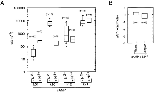 Figure 18. The effect of Ni2+ on HMM rate constants for cAMP. (A) Comparison of rate constants for cAMP with and without Ni2+. Values for the rate constants were determined by HMM analysis. The horizontal line within each box indicates the median of the data, boxes show the 25th and 75th percentiles of the data, and whiskers show the 5th and 95th percentiles. Extreme data points are also indicated. (B) Comparison of values for ΔG0 for activation by cAMP in the presence of Ni2+ between macroscopic and single-channel experiments. |