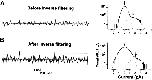 Figure 6. Effects of inverse filtering on cAMP openings. Representative cAMP current traces at +80 mV are shown before (A) and after (B) inverse filtering along with amplitude histograms shown on log-linear axes. The dotted lines on the traces are separated by 2.2 pA. The amplitude histograms were fit by the sum of two Gaussians, which appear as parabolas on log-linear axes. The fit parameters before inverse filtering were: μopen = 1.5 pA, σclosed = 0.29 pA, σopen = 0.65 pA, Popen = 0.006. The fit parameters after inverse filtering were μopen = 2.1 pA, σclosed = 0.49 pA, σopen = 0.61 pA, Popen = 0.004. |