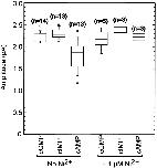 Figure 8. Single-channel amplitude variation across experiments. Box plots of the values for the single-channel amplitude as determined by fitting the sum of two Gaussians to inverse-filtered data. The horizontal line within each box indicates the median of the data; boxes show the 25th and 75th percentiles of the data; whiskers show the 5th and 95th percentiles. Extreme data points are also indicated. The median single-channel conductance was 2.25 pA for cGMP, 2.27 pA for cIMP, 1.87 pA for cAMP, 2.15 pA for cGMP with Ni2+, 2.46 pA for cIMP with Ni2+, and 2.21 pA for cAMP with Ni2+. |