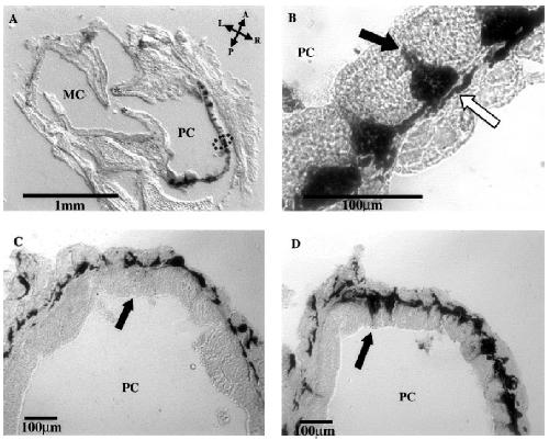animals, indicated by open arrow, are not riboprobe-stained cells. (C and D) Control experiment, hybridization of neighbouring sections with (C) sense and