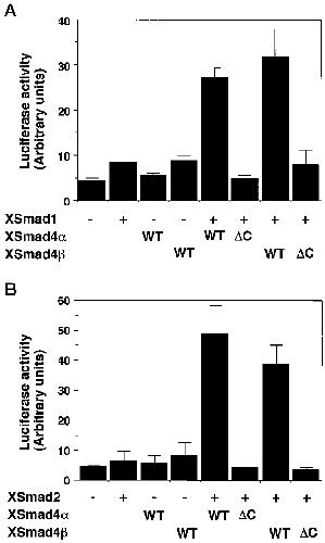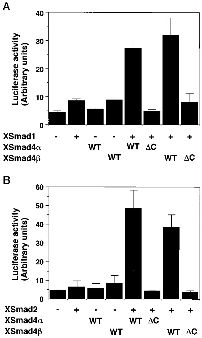 XSmad2 with or without either of the XSmad4s (B). Cells were harvested