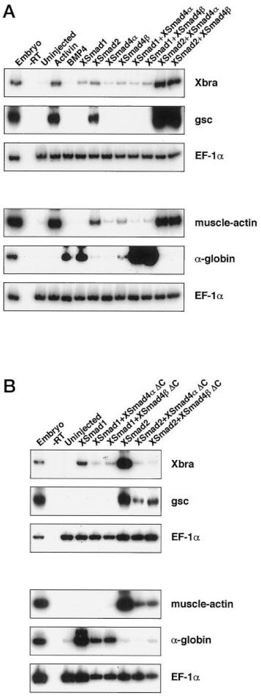 FIG. 3. XSmad4a and XSmad4b synergize with XSmad1 and