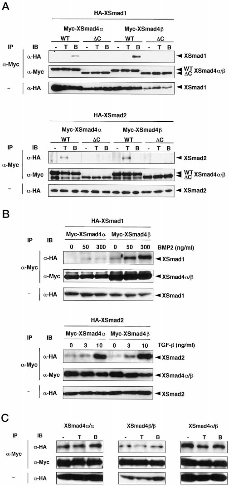 Myc-XSmad4b combined with HA-XSmad1 or HA-Smad2 and stimulated