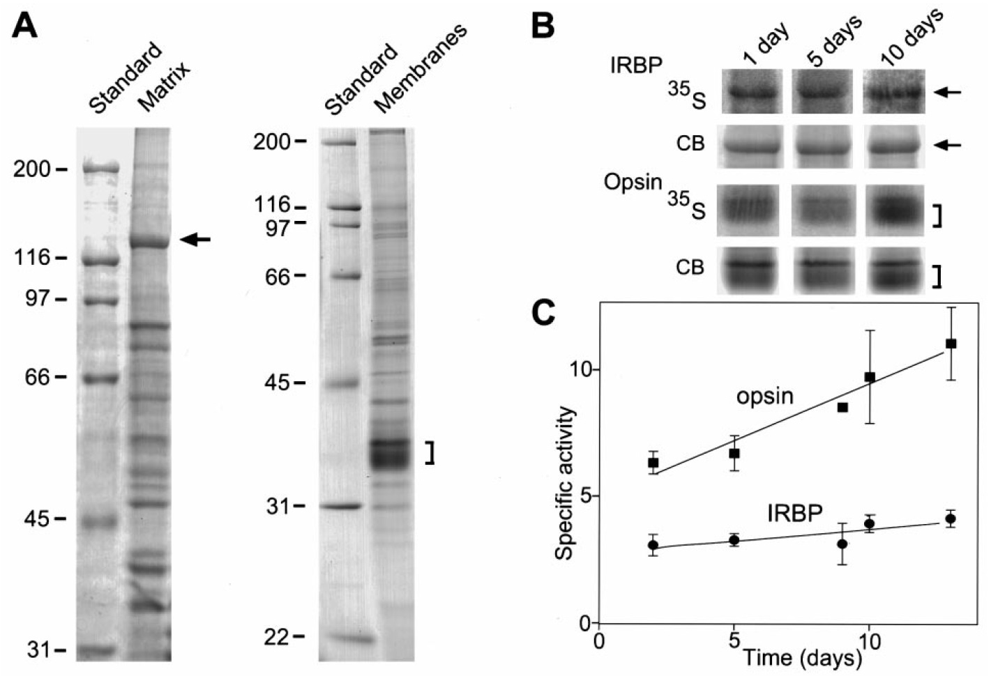 The interphotoreceptor matrix (IPM) is a highly-organized extracellular matrix critical to retinal development and function. Although the concentrations of its components are carefully regulated, little is known about the mechanisms of this regulation. Interphotoreceptor retinoid-binding protein (IRBP) is the most abundant soluble protein component of the IPM. Although its rate of clearance is thought to be an important factor regulating the concentration of IRBP within the IPM, no study has measured the rate of its extracellular turnover. Here we determine the rate of turnover of matrix IRBP in Xenopus. The rate of IRBP turnover was estimated by measuring the loss of radioactivity from protein labeled by a single injection of a radiolabeled protein precursor. To provide an estimate of the rate of IRBP turnover, we have examined the following issues: (1) Quantitative extraction of IRBP from the IPM for biochemical analysis. (2) Routes of delivery of radiolabeled precursor to achieve a pulse label in vivo. (3) Selection of labeled precursor in order to minimize reutilization of radiolabel. Using Western blot analysis, immunoprecipitation and immuno-electron microscopy, we found that IRBP can be quantitatively extracted from the IPM by a simple saline wash. IRBP was radiolabeled by systemic or intravitreal injection of either [35S]methionine or carboxyl-terminal labeled [1-14C]leucine. The specific activity of matrix IRBP was determined by either phosphorimaging or fluorography of Coomassie blue-stained SDS-polyacrylamide gels. Intravitreal injection of tracer was more effective than systemic delivery in achieving a pulse of radiolabel to the retina. This may be due to intravitreal injection allowing the body to act as a 'sink' for radiolabeled amino acid. When radiolabeled precursor was delivered by intravitreal injection, the calculated half-life of matrix IRBP using [35S]methionine was 25. 6+/-0.82 hr; in contrast, it was 10.7+/-2.9 hr using [1-14C]leucine. The faster apparent IRBP turnover using [1-14C]leucine is interpreted in context of the early decarboxylation of leucine during its degradation. Our results demonstrate rapid turnover of IRBP in the Xenopus IPM in vivo and suggest that the IPM is a dynamic structure undergoing continuous renewal.