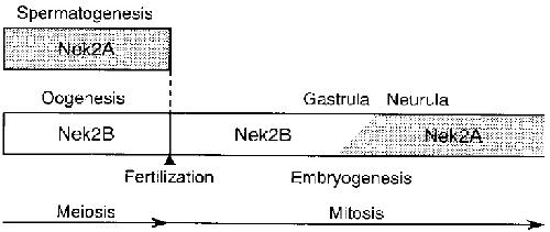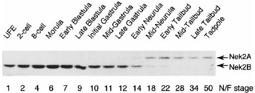FIG. 6. Expression of Nek2A and Nek2B during embryogenesis. After fertilization, five embryos each were sampled at the indicated stages