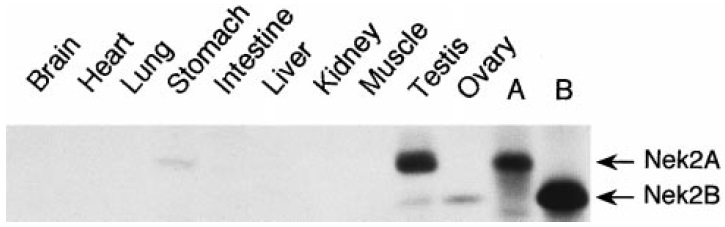 FIG. 4. Organ blot analysis of Nek2A and Nek2B. Total protein